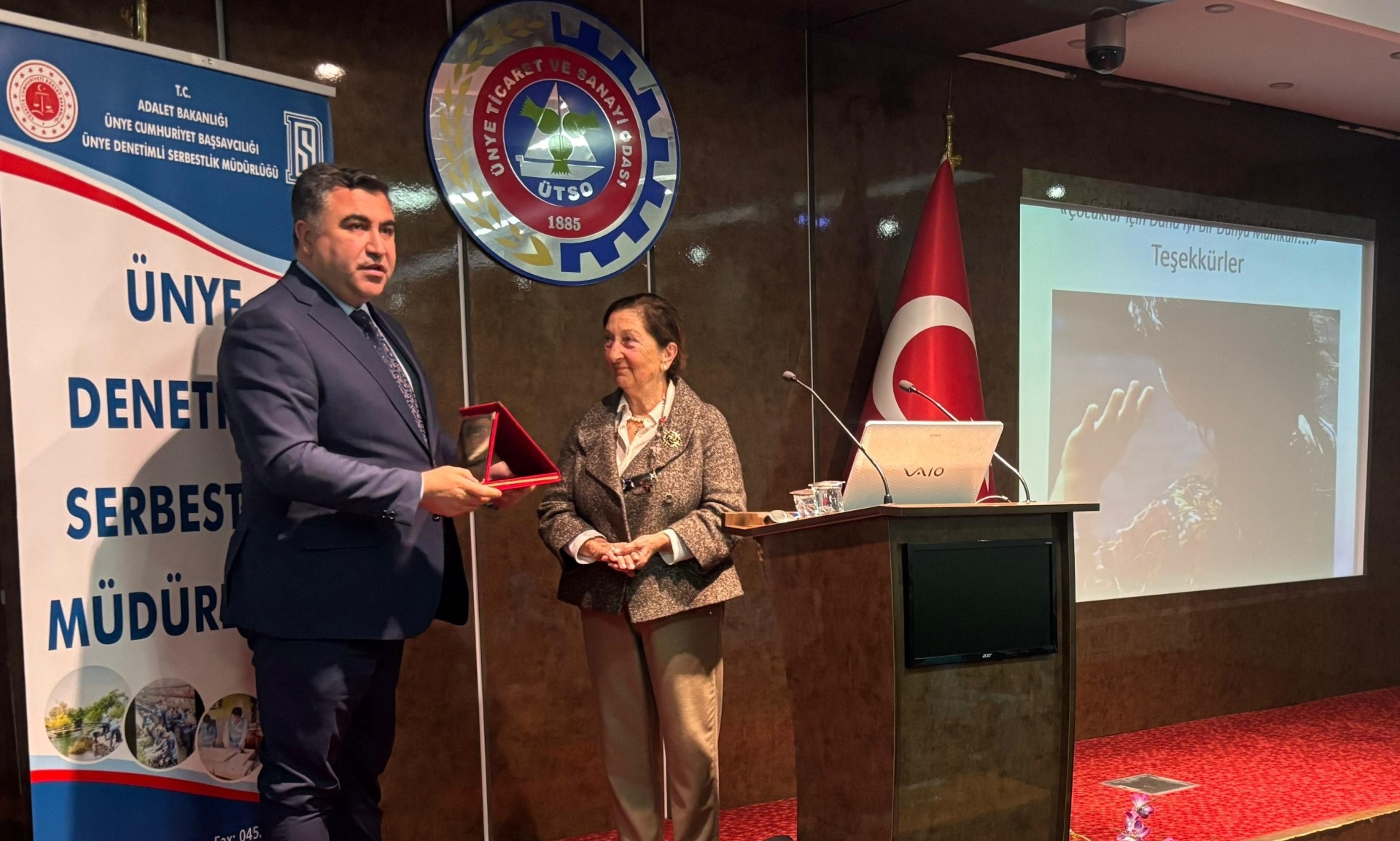 Programın akabinde, Ünye Cumhuriyet Başsavcısı Hayri ORMANCI tarafından “Aile Yılı” temasıyla gerçekleştirilen eğitim programına önemli katkılar sunan Prof. Dr. Ayşe Haznedar Yalın’a teşekkür plaketi takdim etti